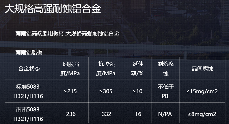 铝合金的高韧性、抗腐蚀性以及可焊性为建造对重量要求严格的船型提供了很好的选择,由于铝的加工成本较低,因此使用铝材制造船舶更具经济性。铝合金可以作为板材,也可以进行挤压成型加工和铸造加工。再加上铝合金突出的物理特性,使得用铝合金制造船舶十分具有经济性。从船舶设计者角度来看,使用铝合金制造的船舶可以达到更高的速度以及更长的使用寿命,铝合金的这些优点,使其在船舶的应用上发展得很快, 造船业为铝材提供了广阔的应用市场,主要应用于高速船体外板、甲板、骨架结构、船舶上层建筑、海上直升机平台、海洋工程平台居住区等。船用铝板带材通过了DNVGL、CCS、ABS、BV、LR五大船级社工厂认可。