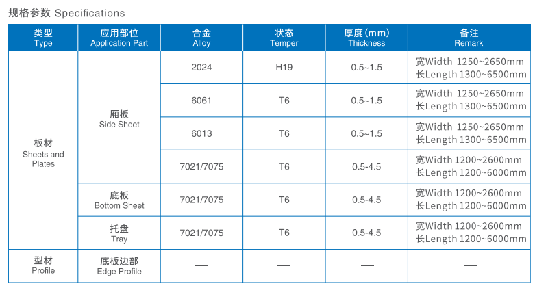 航空中使用的主要铝合金是2ххх, 6ххх 和 7ххх 系。 2xxx系铝合金可用于高温环境中,以及需要提高屈服强度系数的环境中。7xxx铝合金可用于低温环境中的高负荷部件上,以及高压环境中的高强耐腐蚀部件中。 6xxx铝合金可用于低负荷部件中,以及液压、润滑和燃油系统中。可根据不同的国际标准或客户要求,为客户供应机身、饰件、飞行员与乘客座椅框架以及机翼结构部件所需的铝合金薄板、中厚板、锻件和挤压件材料。